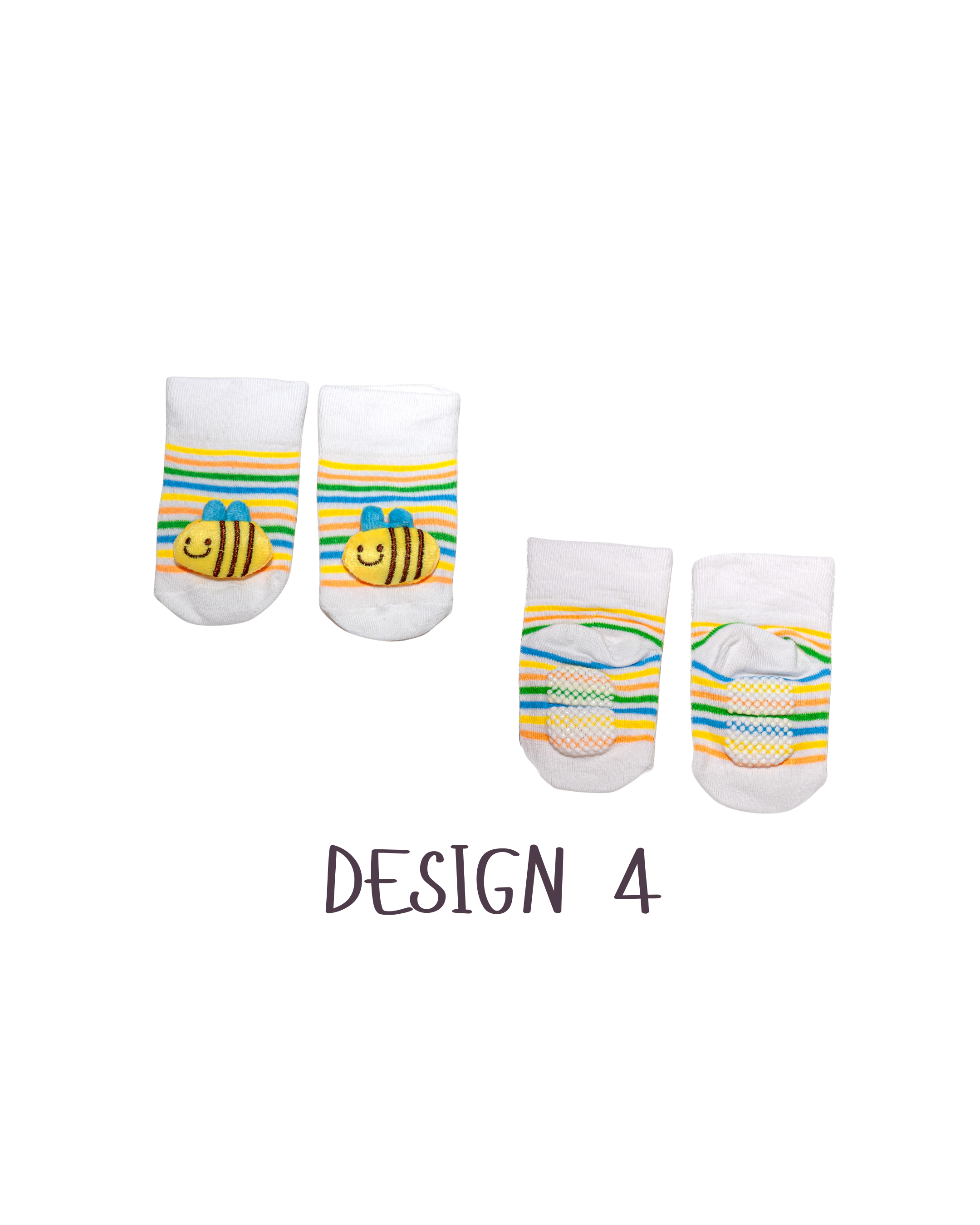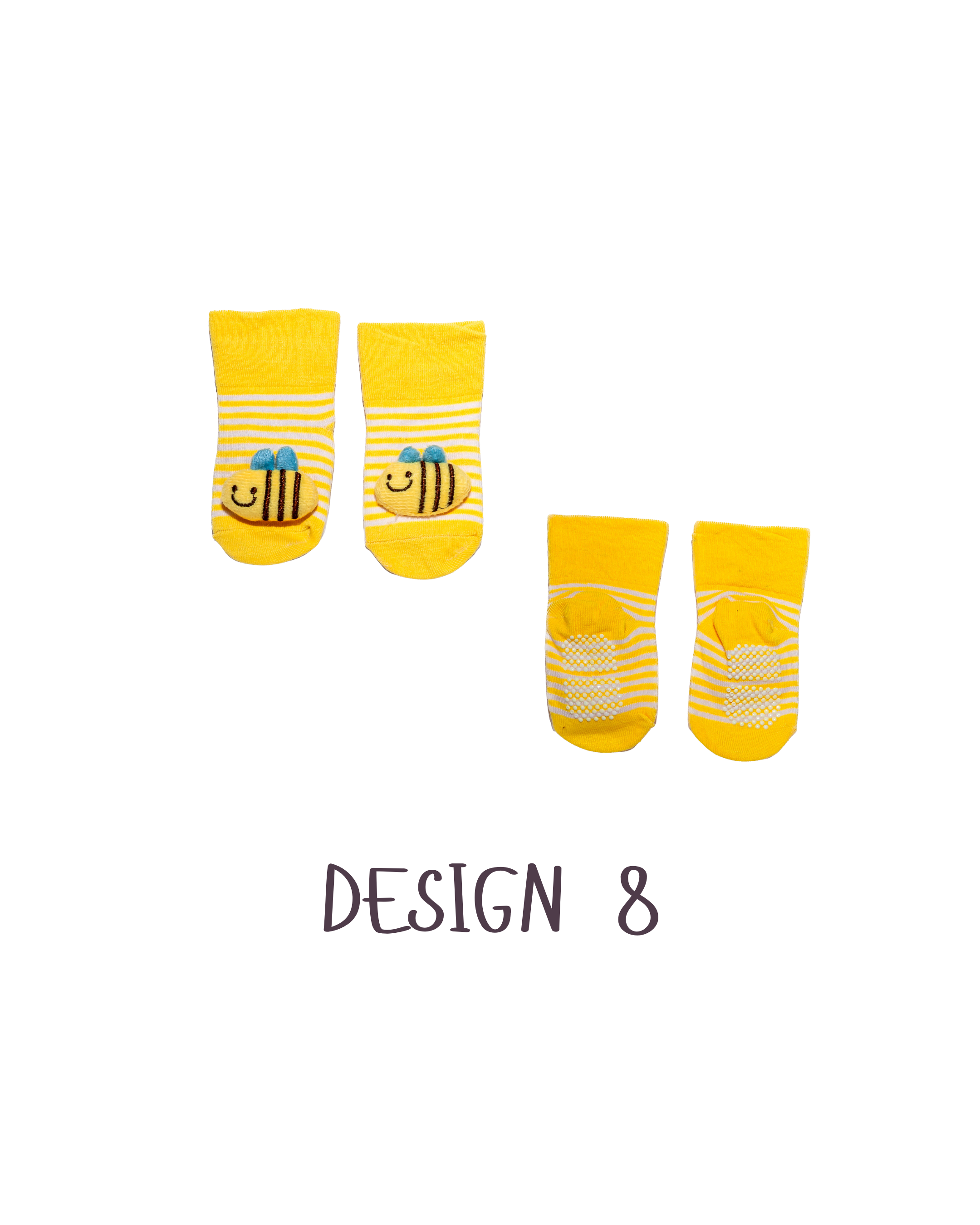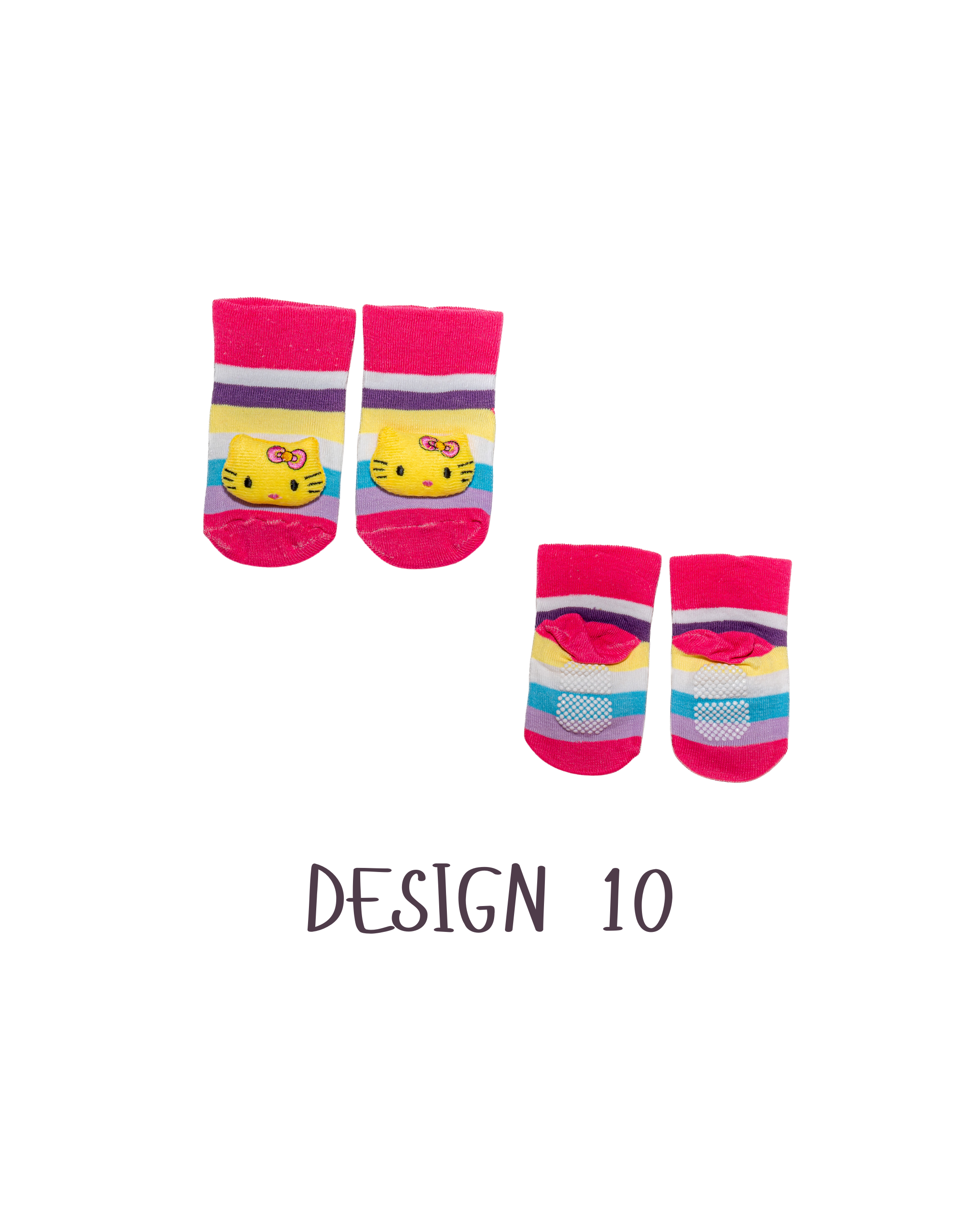 Cute and colorful baby socks with anti-slip grips, available in assorted cartoon designs.