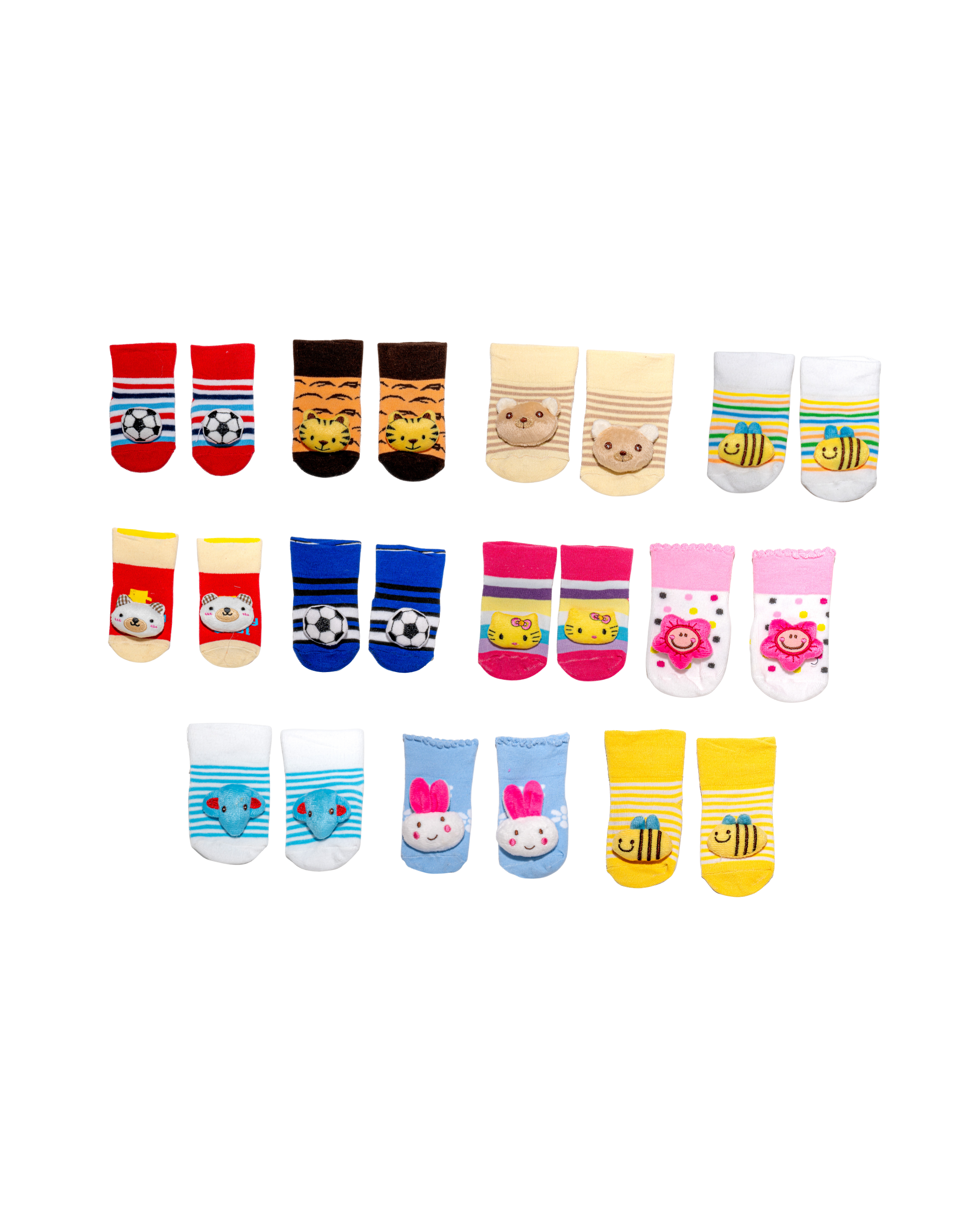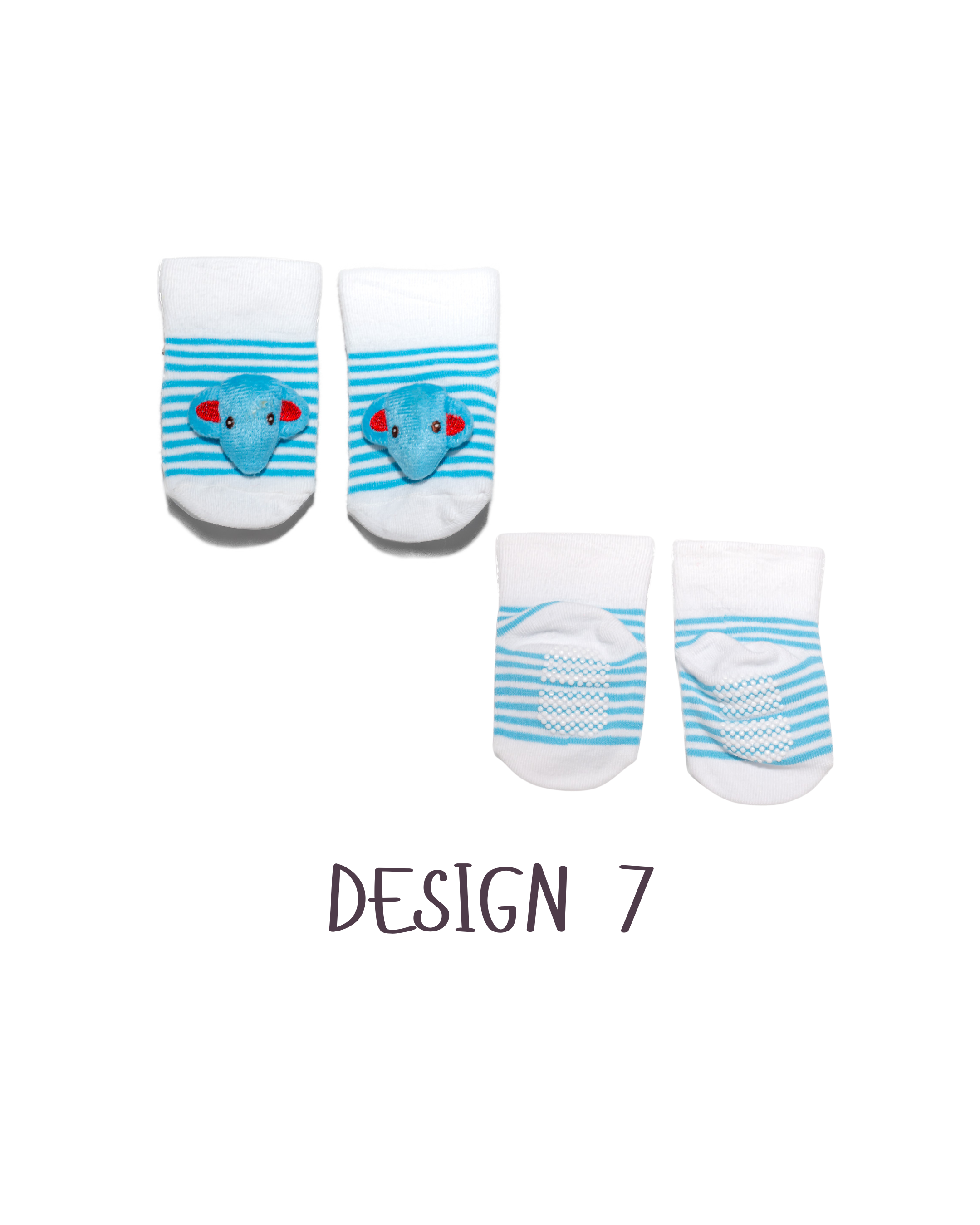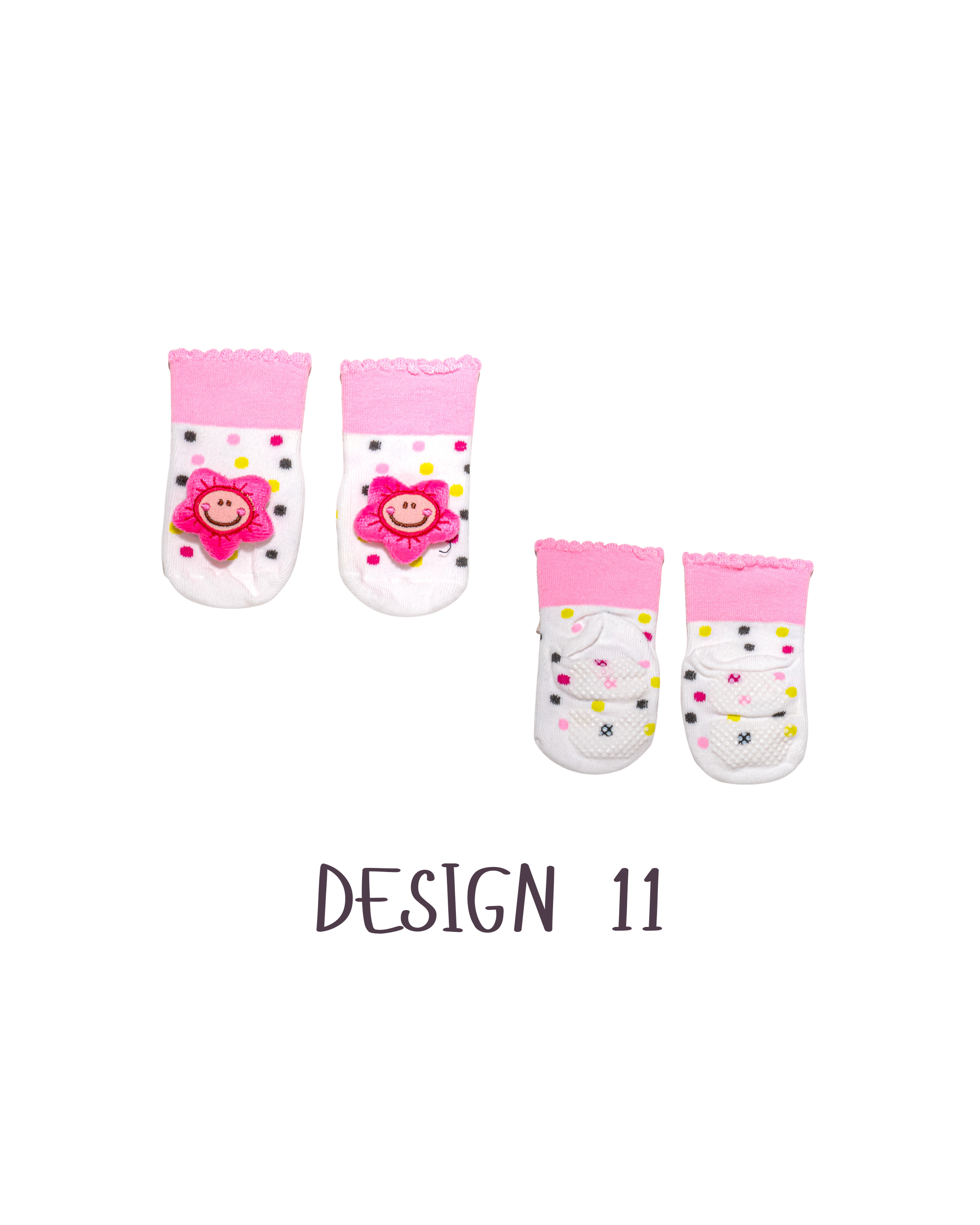 Cute and colorful baby socks with anti-slip grips, available in assorted cartoon designs.
