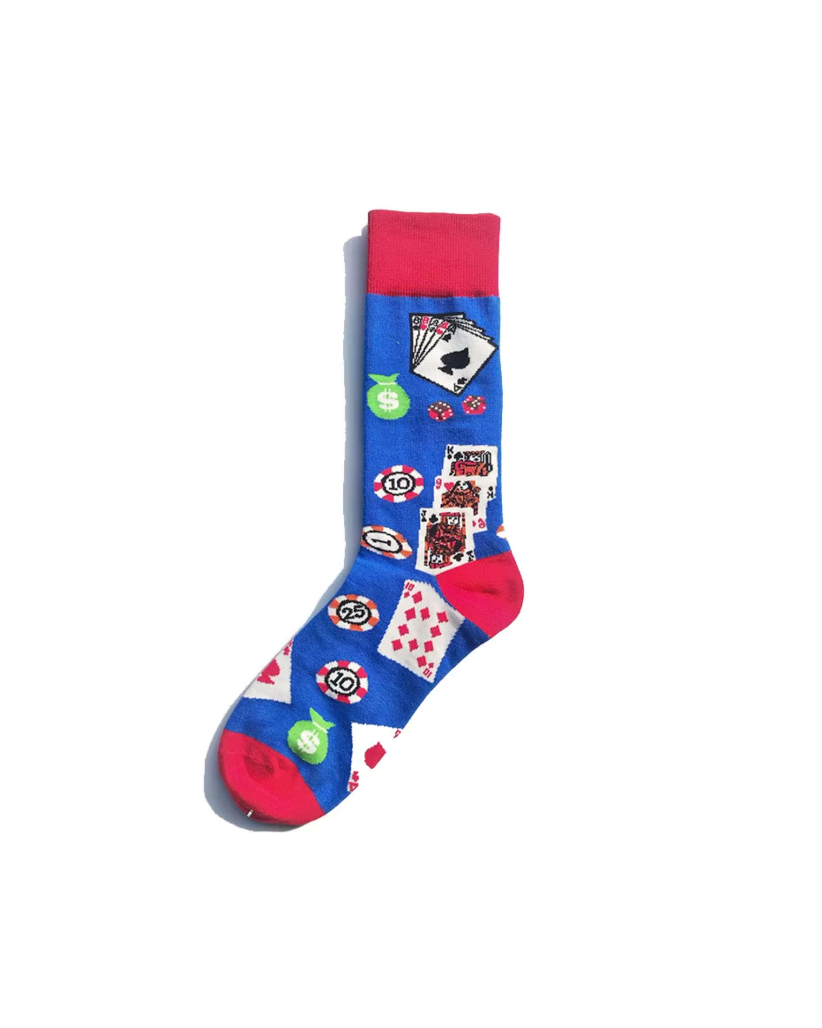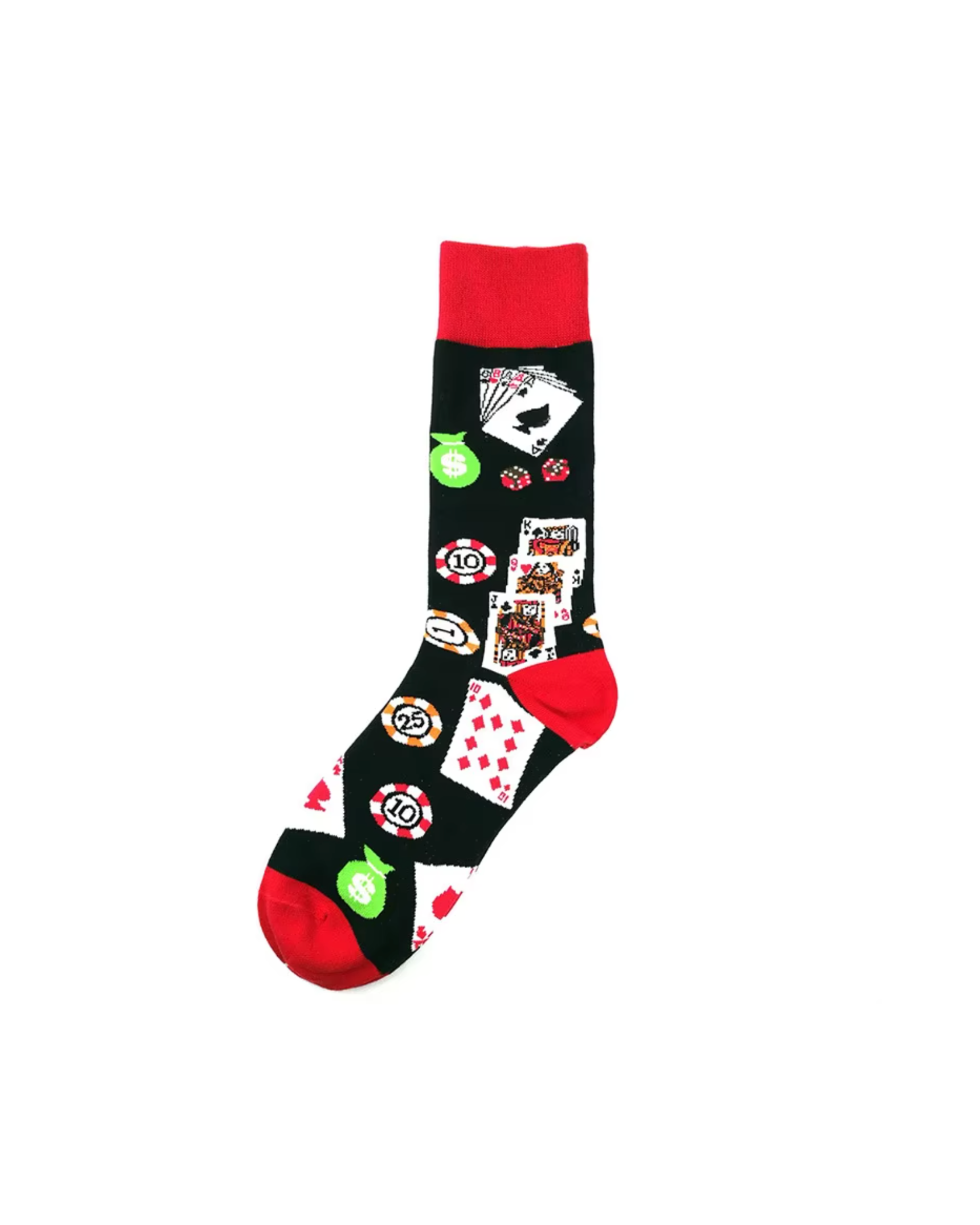 Designed for everyday comfort with a playful twist, this pair of crew socks features casino-inspired graphics such as playing cards, poker chips, dice, and game icons. The bold pattern adds a fun and eye-catching look that stands out with casual outfits.