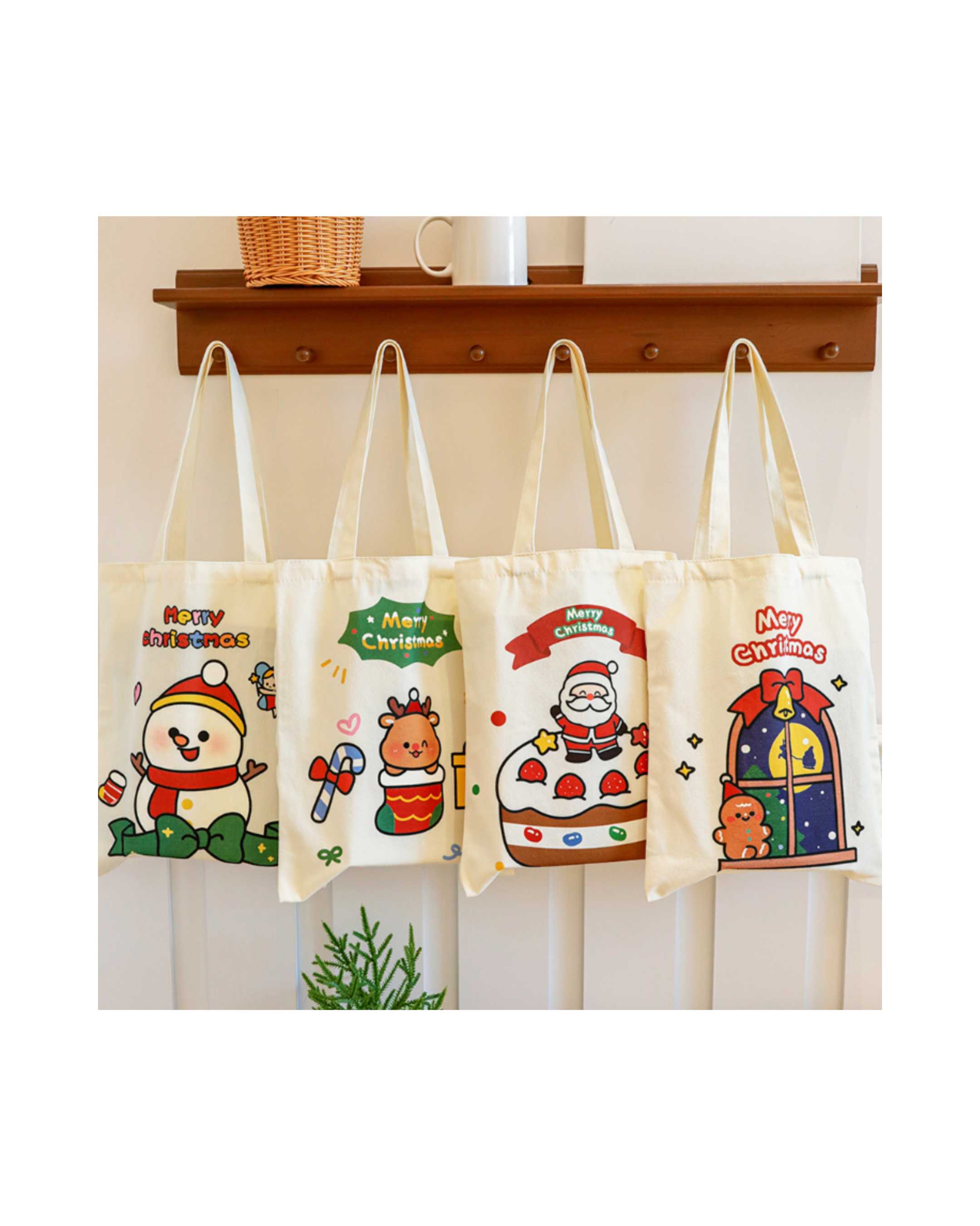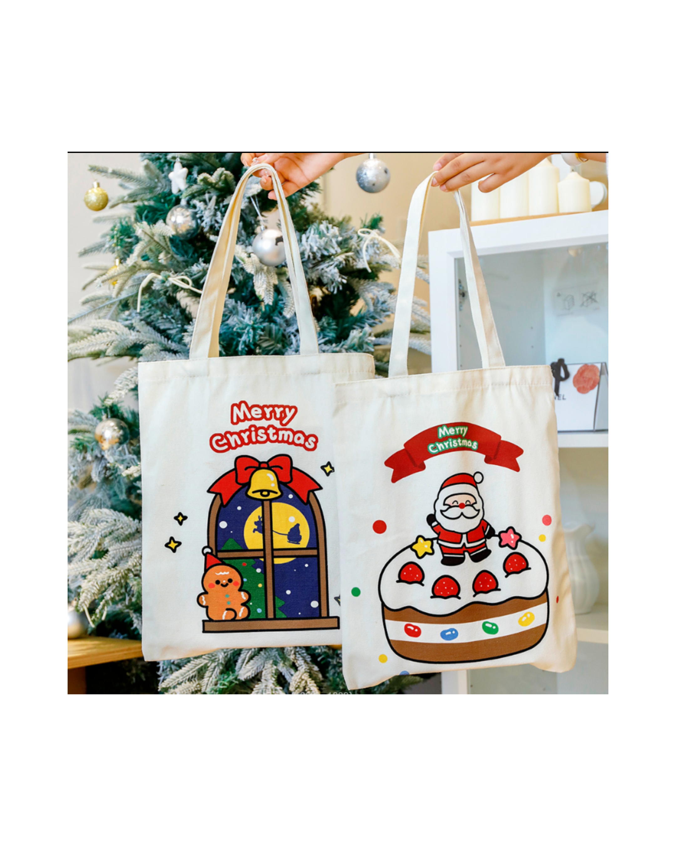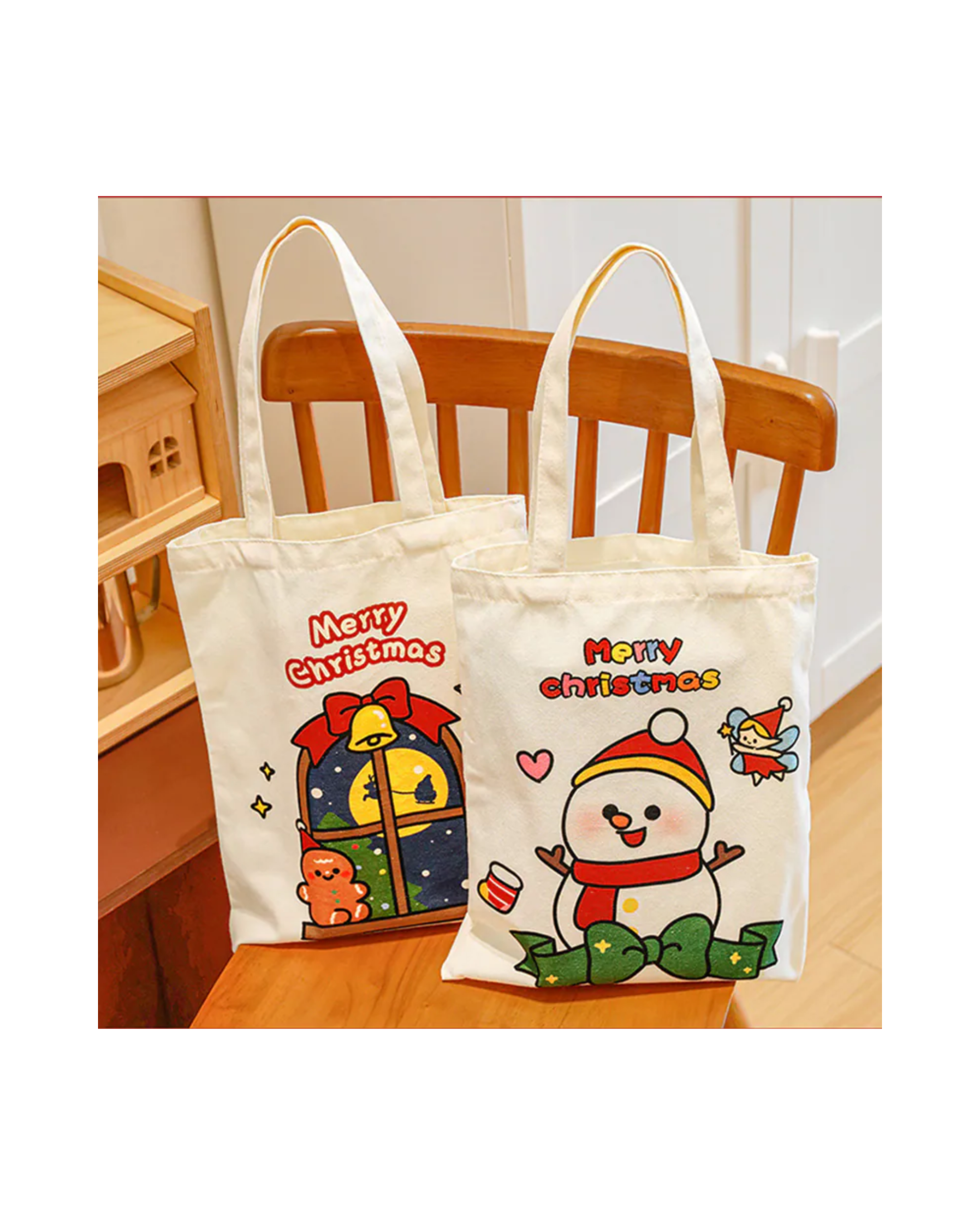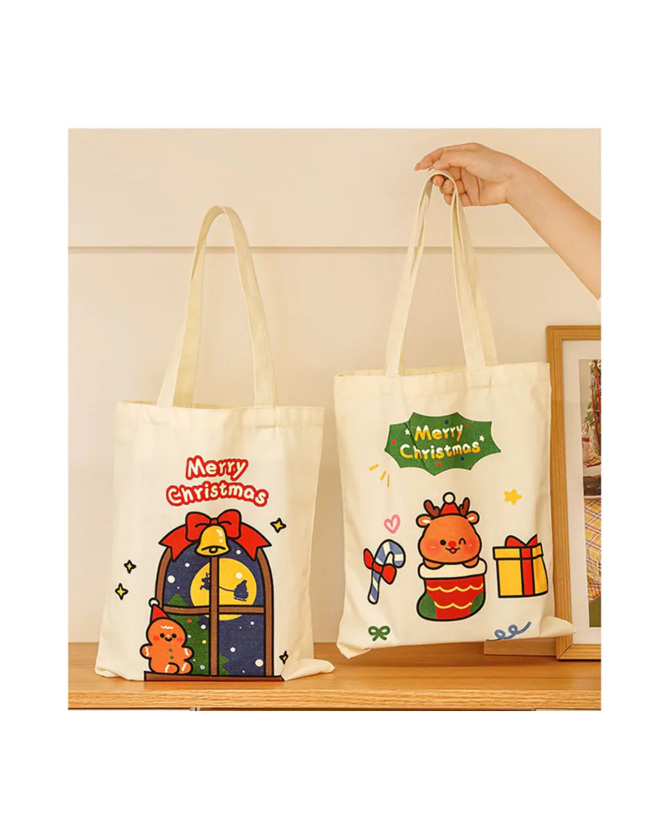 Reusable Christmas-themed canvas tote bag with cute holiday prints. Durable and eco-friendly.