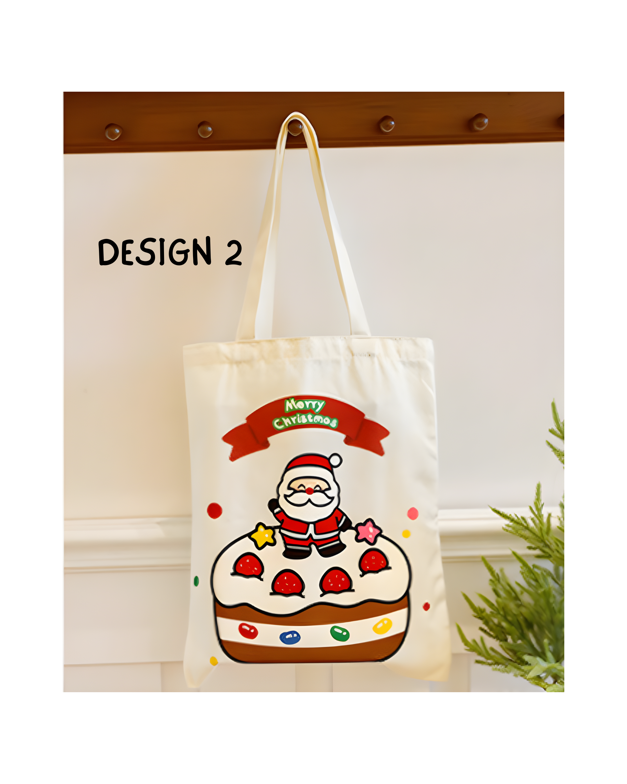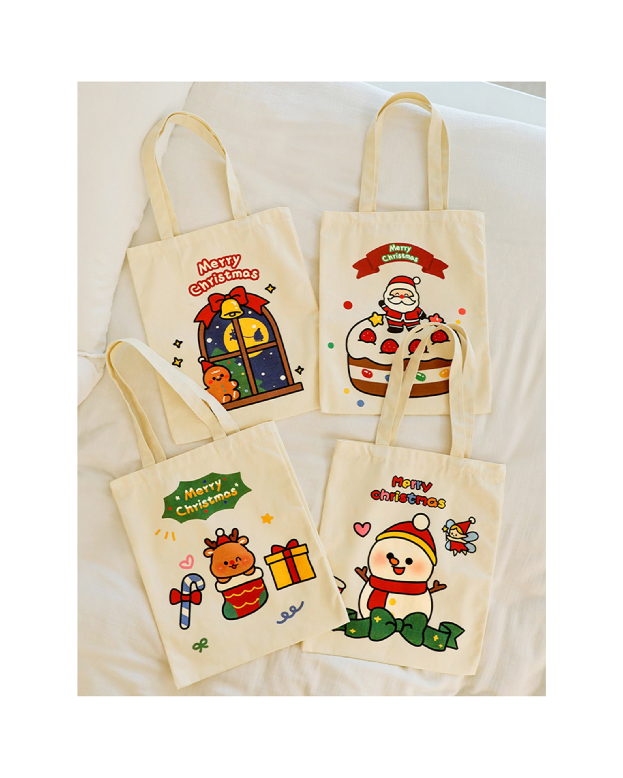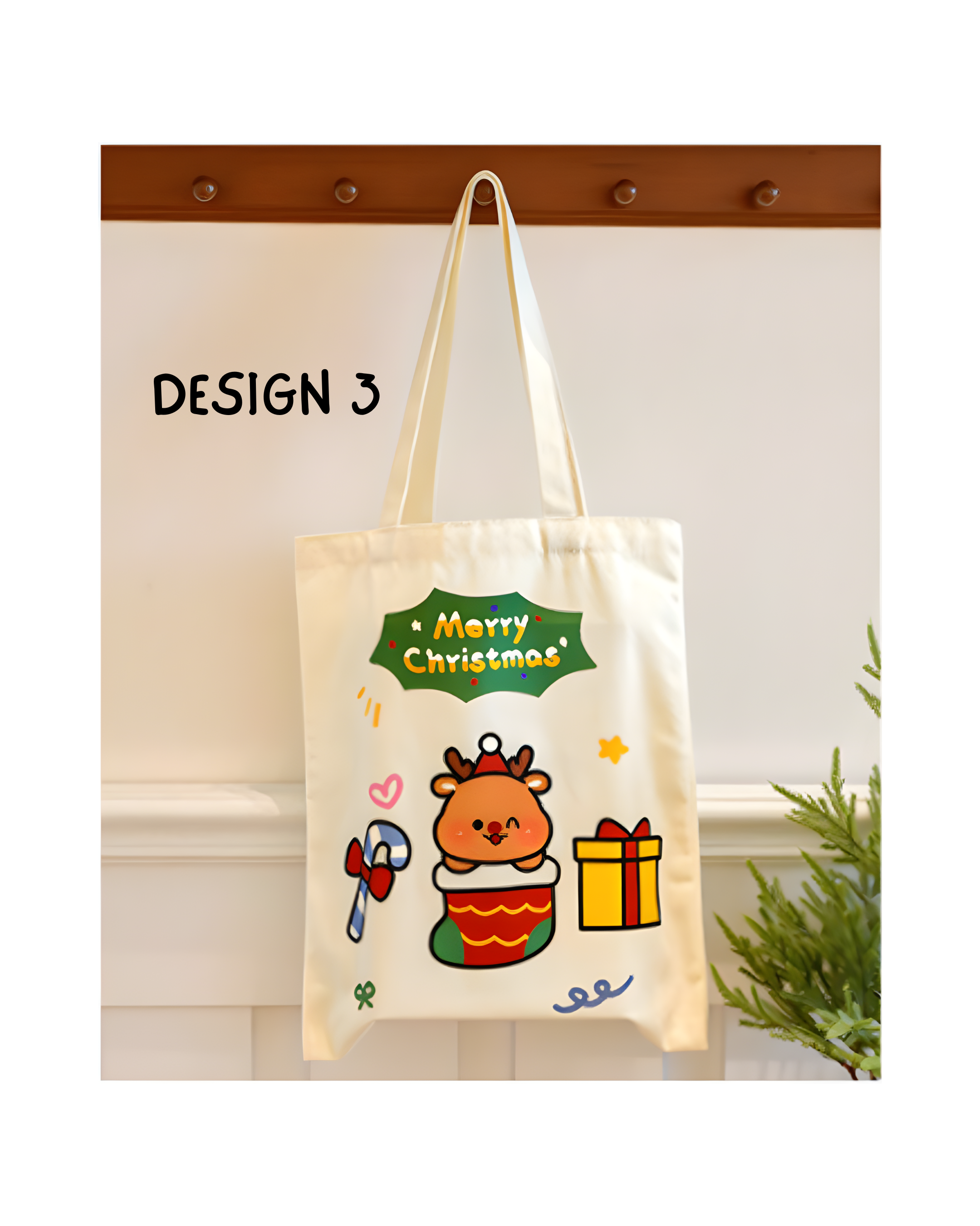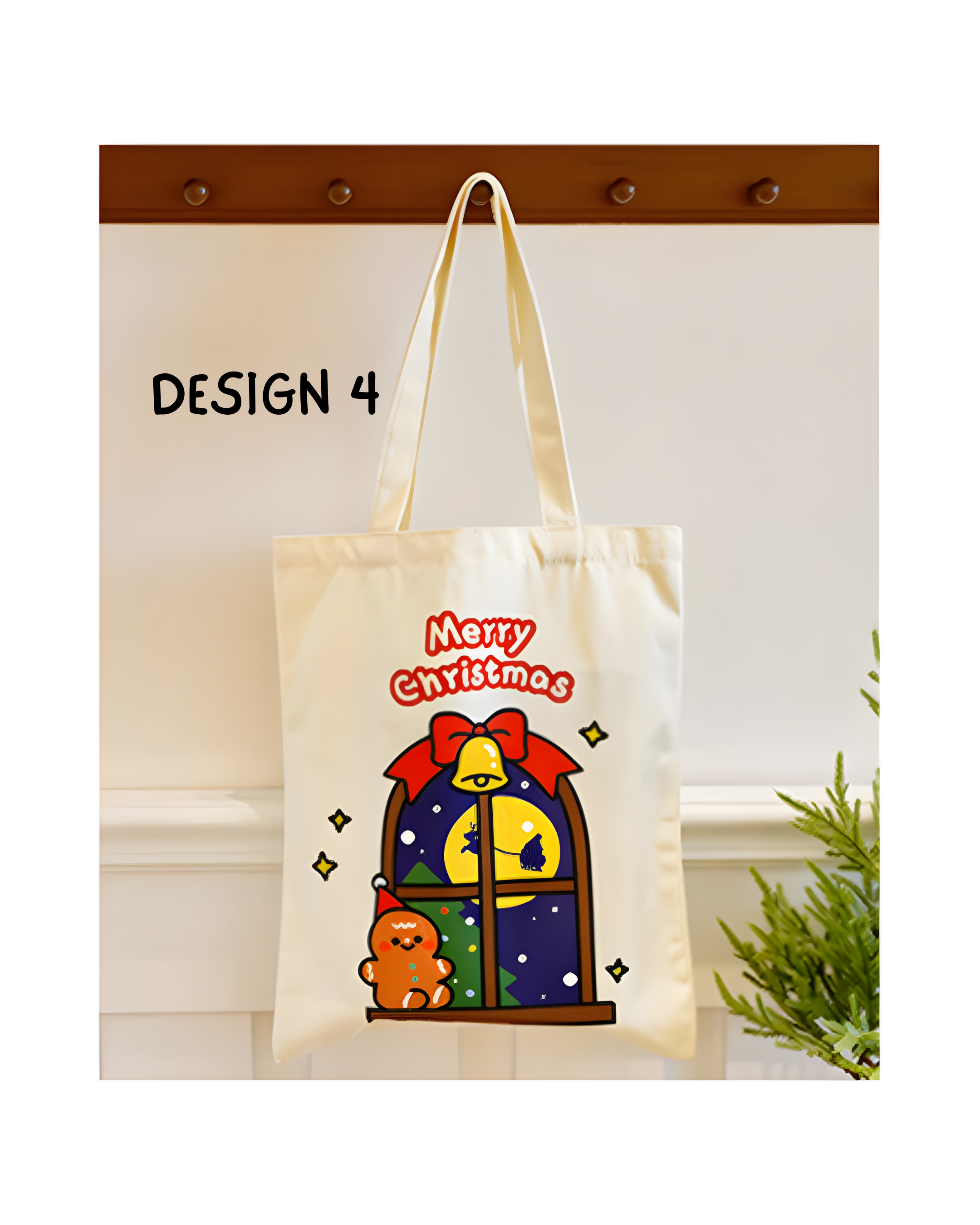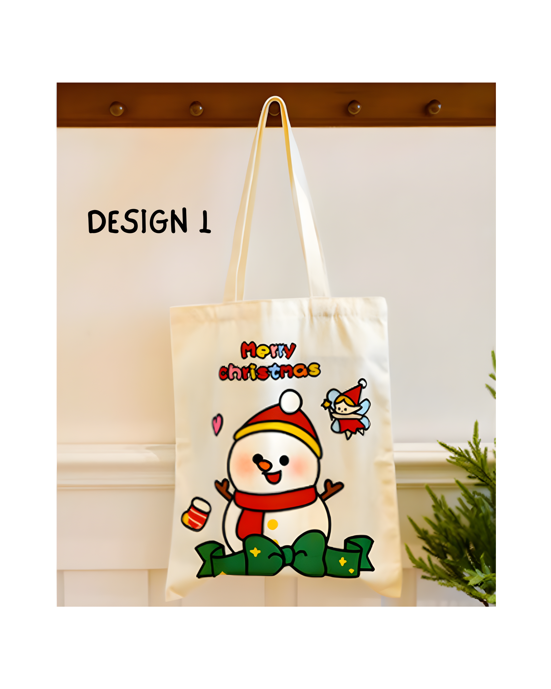 Reusable Christmas-themed canvas tote bag with cute holiday prints. Durable and eco-friendly.