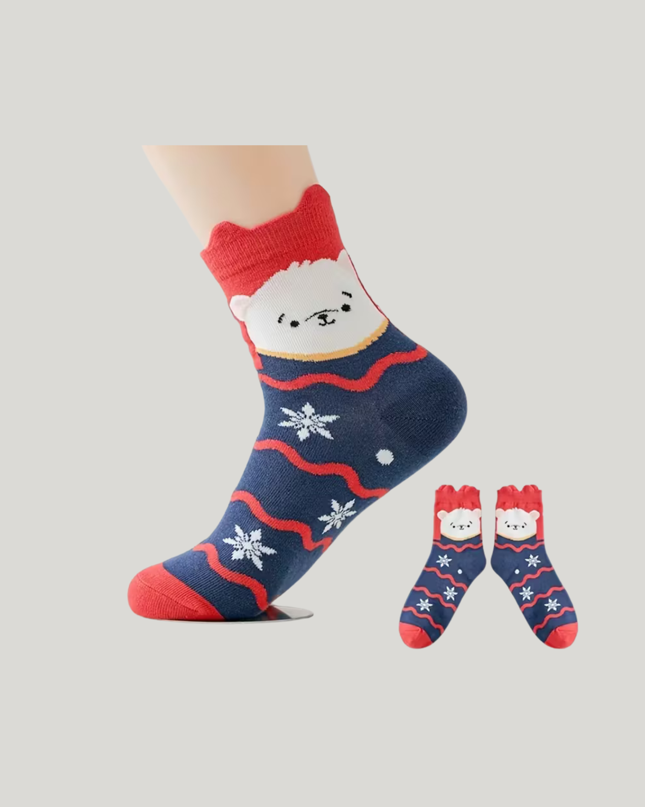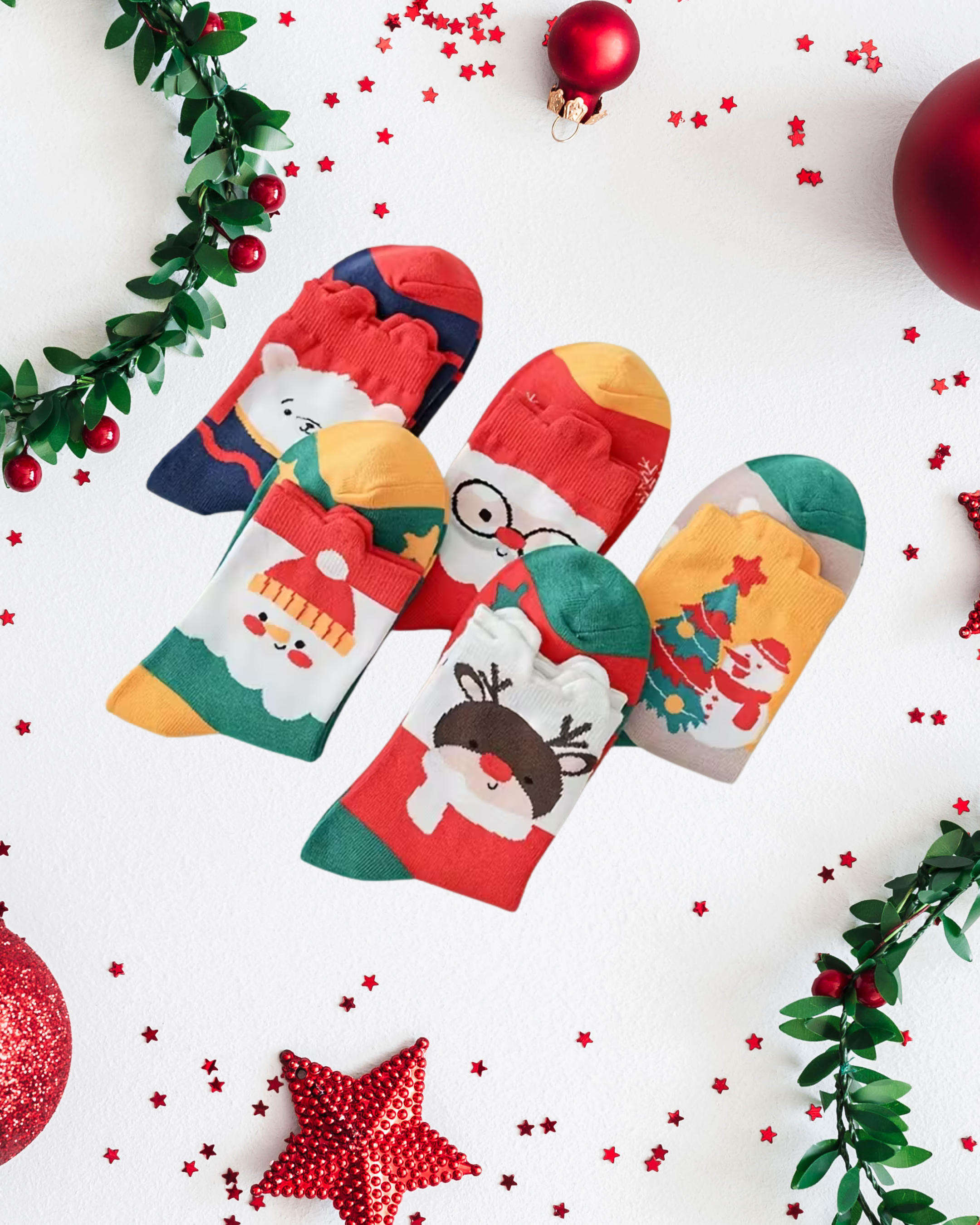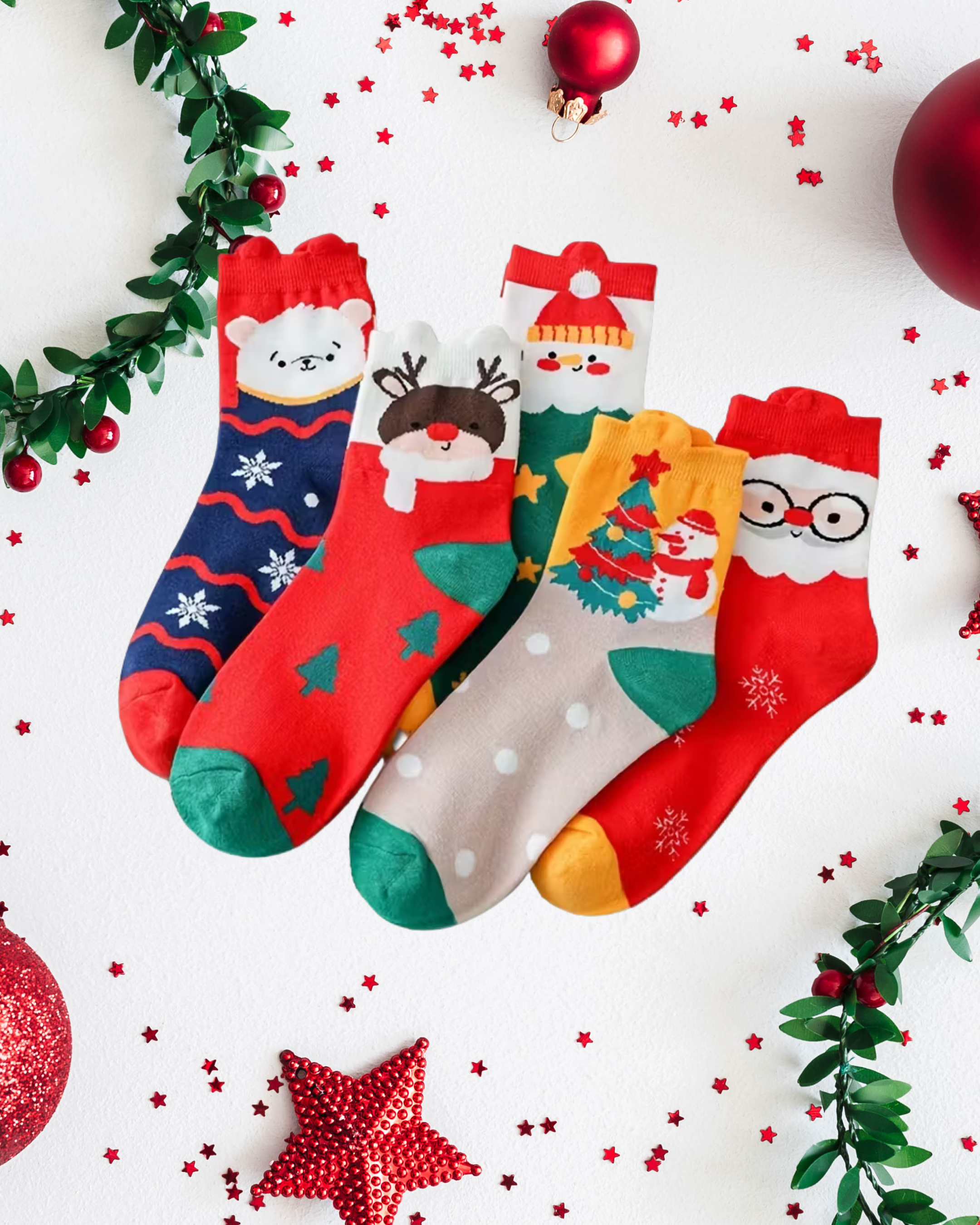 Celebrate the season in style with these Christmas Cute Character Above the Ankle Socks. Each set comes with 5 unique festive designs featuring Santa, reindeer, snowman, Christmas tree, and holiday bear. Made from a soft cotton blend, these socks are breathable, comfortable, and perfect for everyday wear or adding holiday cheer to your outfit. Great for personal use or as a thoughtful Christmas gift.