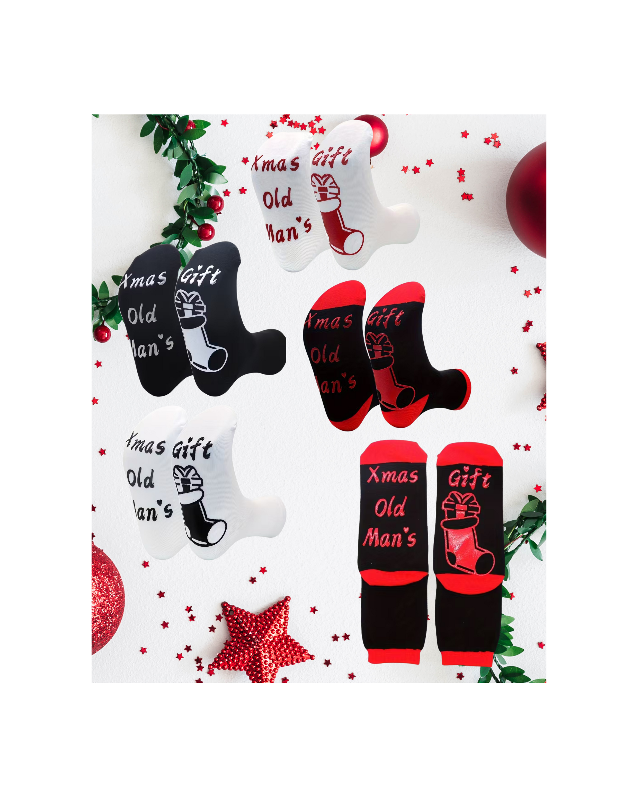Celebrate the holidays in style with the Christmas Gift Stocking Print Crew Socks! Each pair showcases festive “Xmas Gift Old Man’s” stocking designs in fun color options. Perfect for cozy wear, gifting, or spreading holiday cheer.