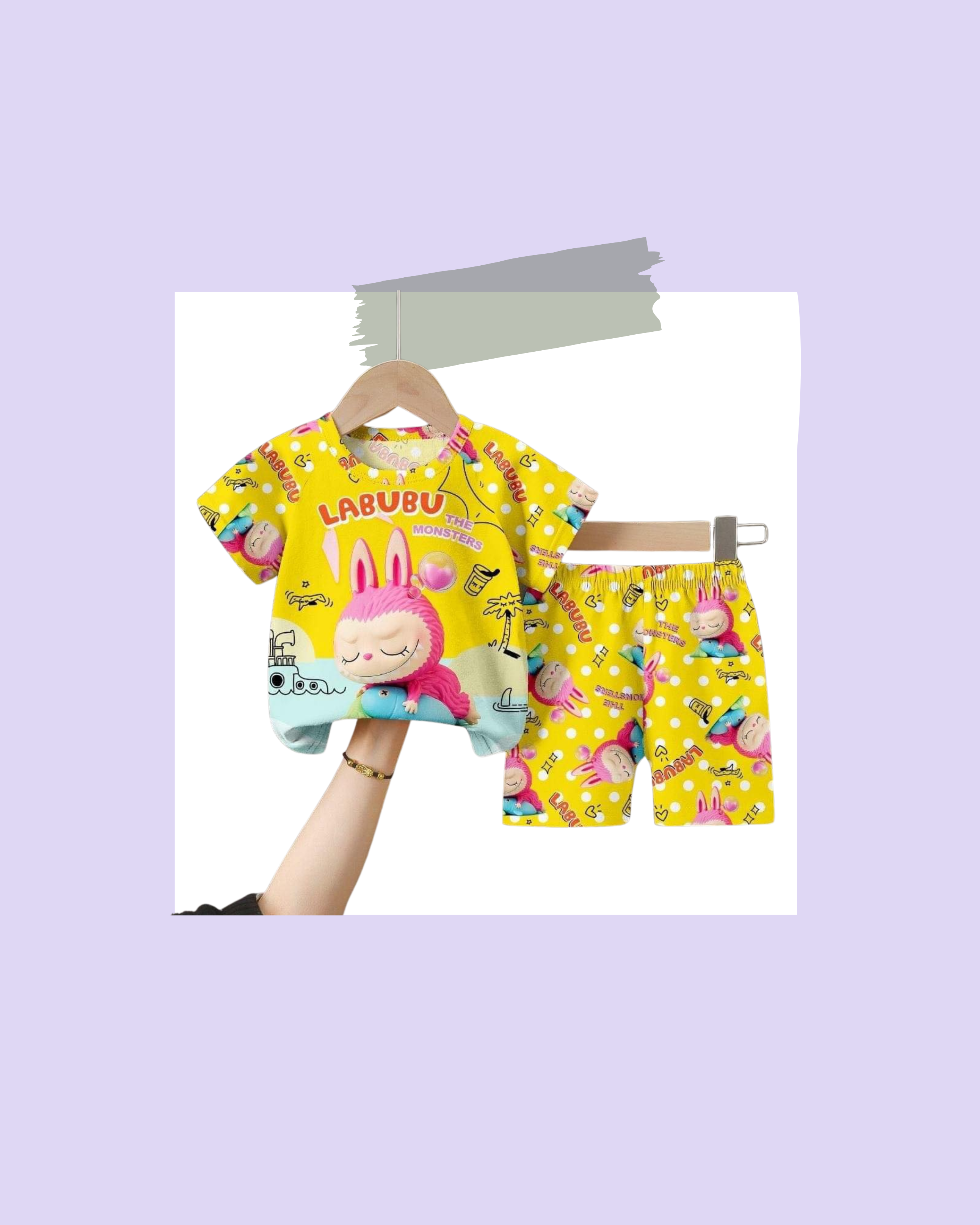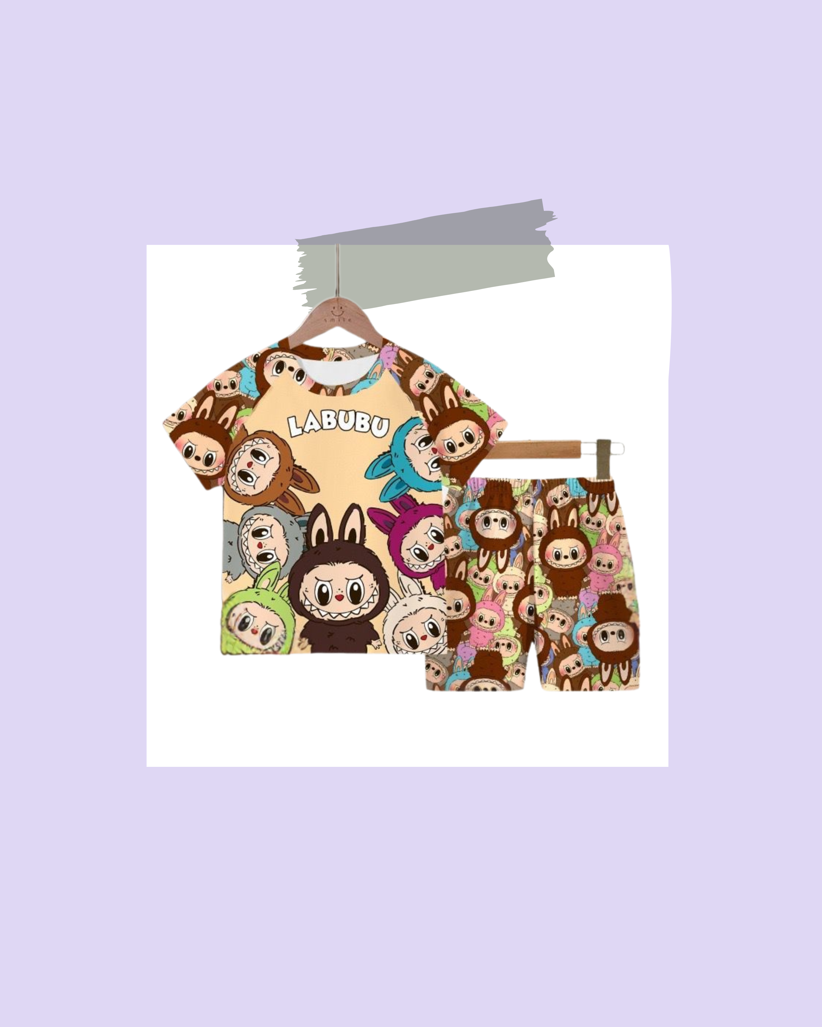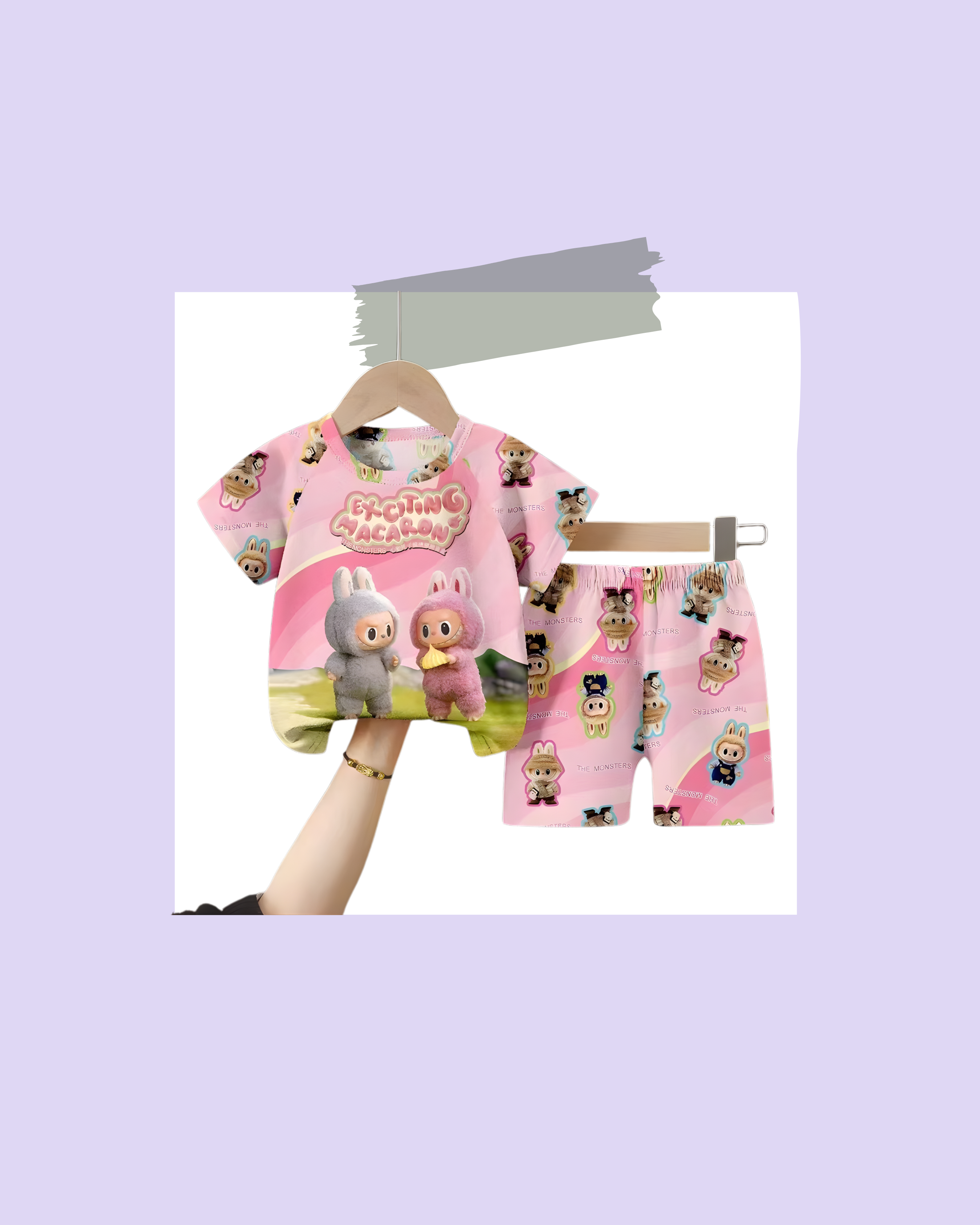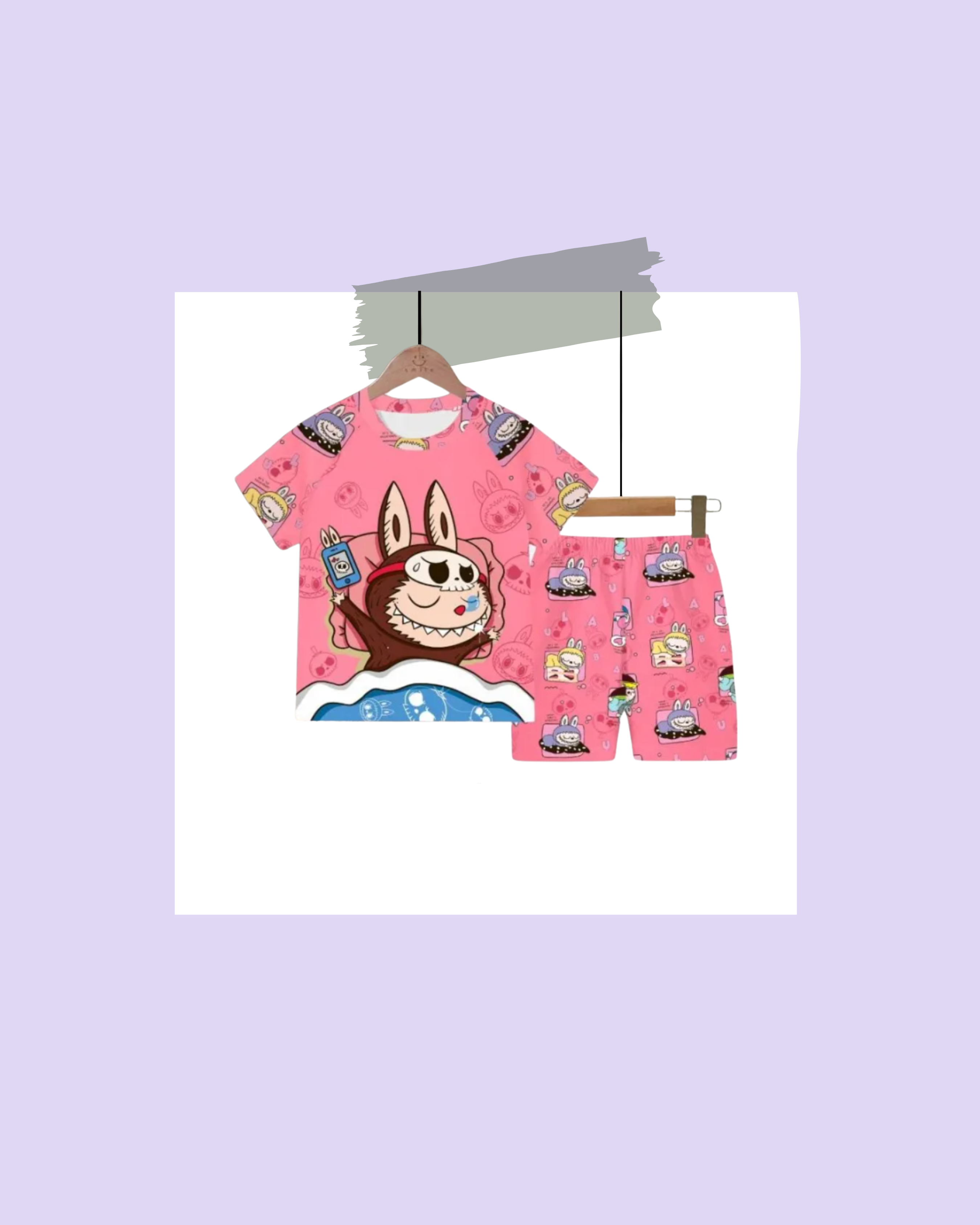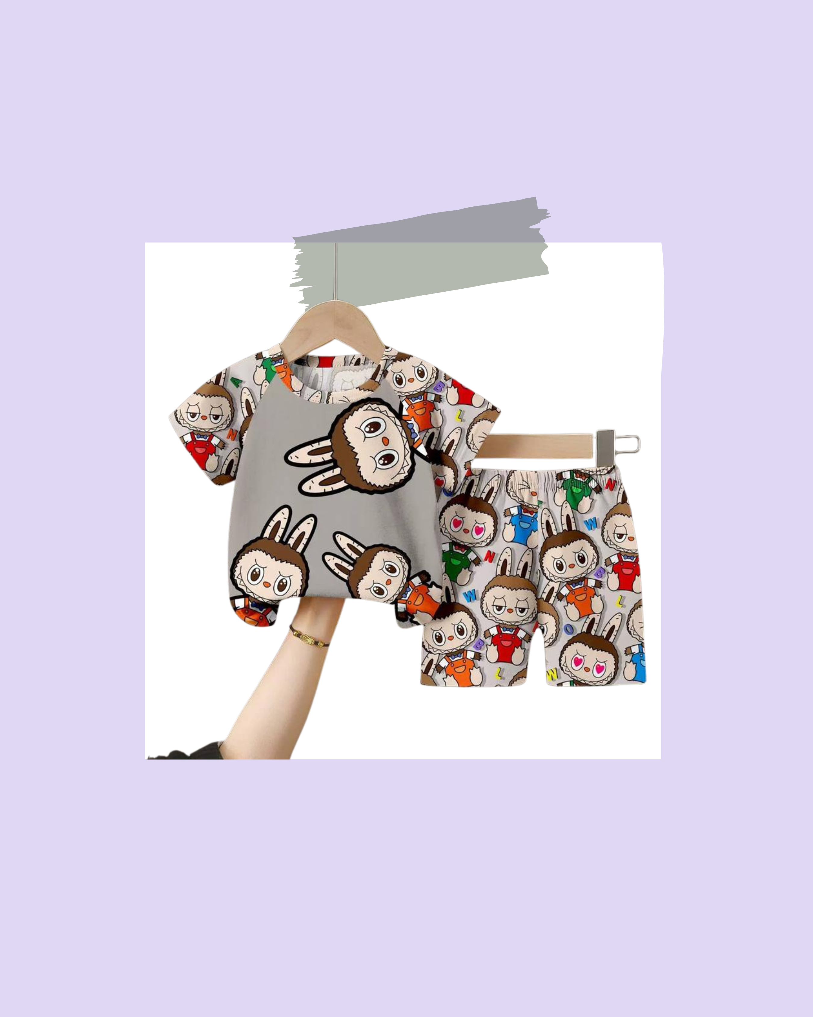 Colorful cartoon-print t-shirt and shorts set for kids, perfect for everyday wear and playtime.