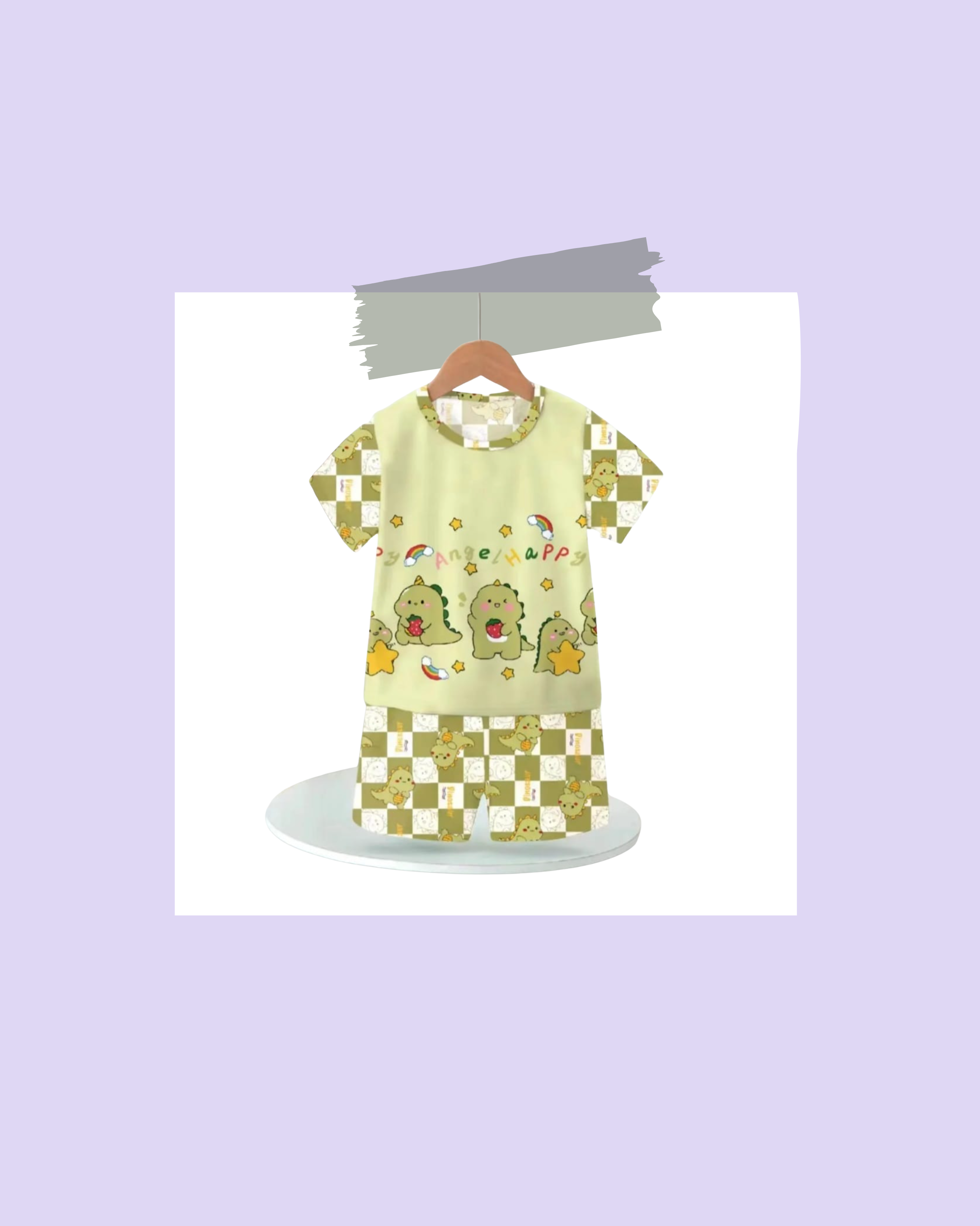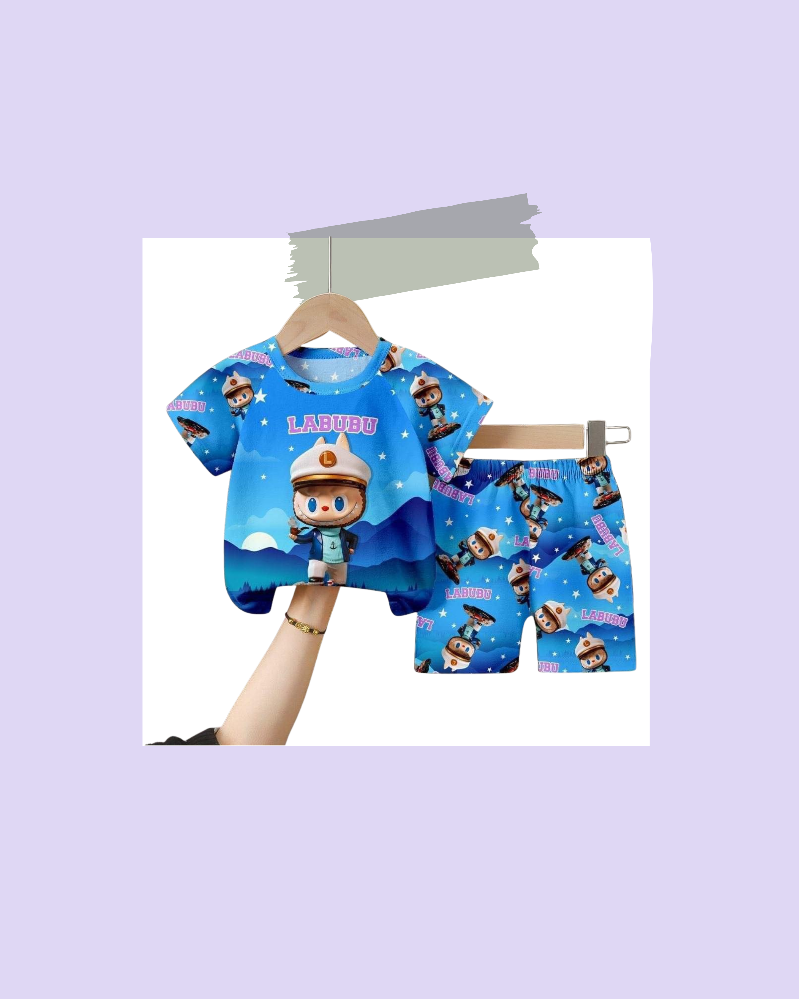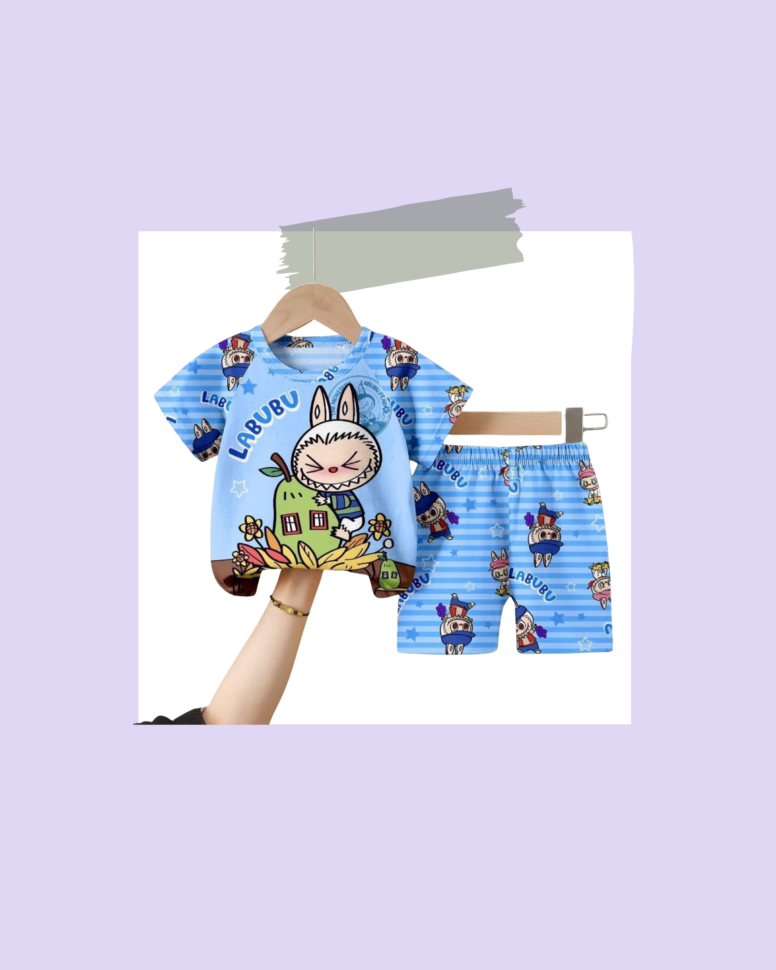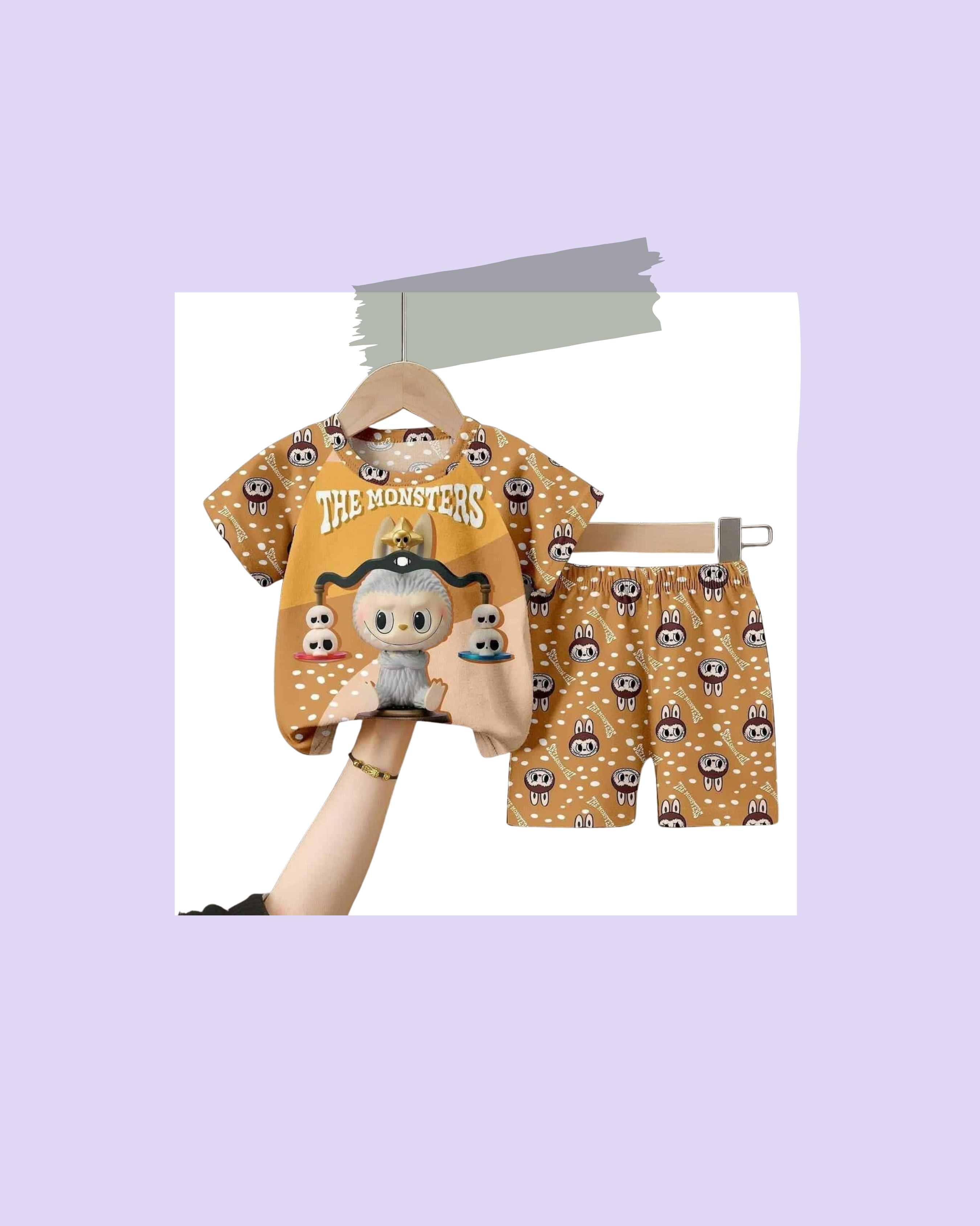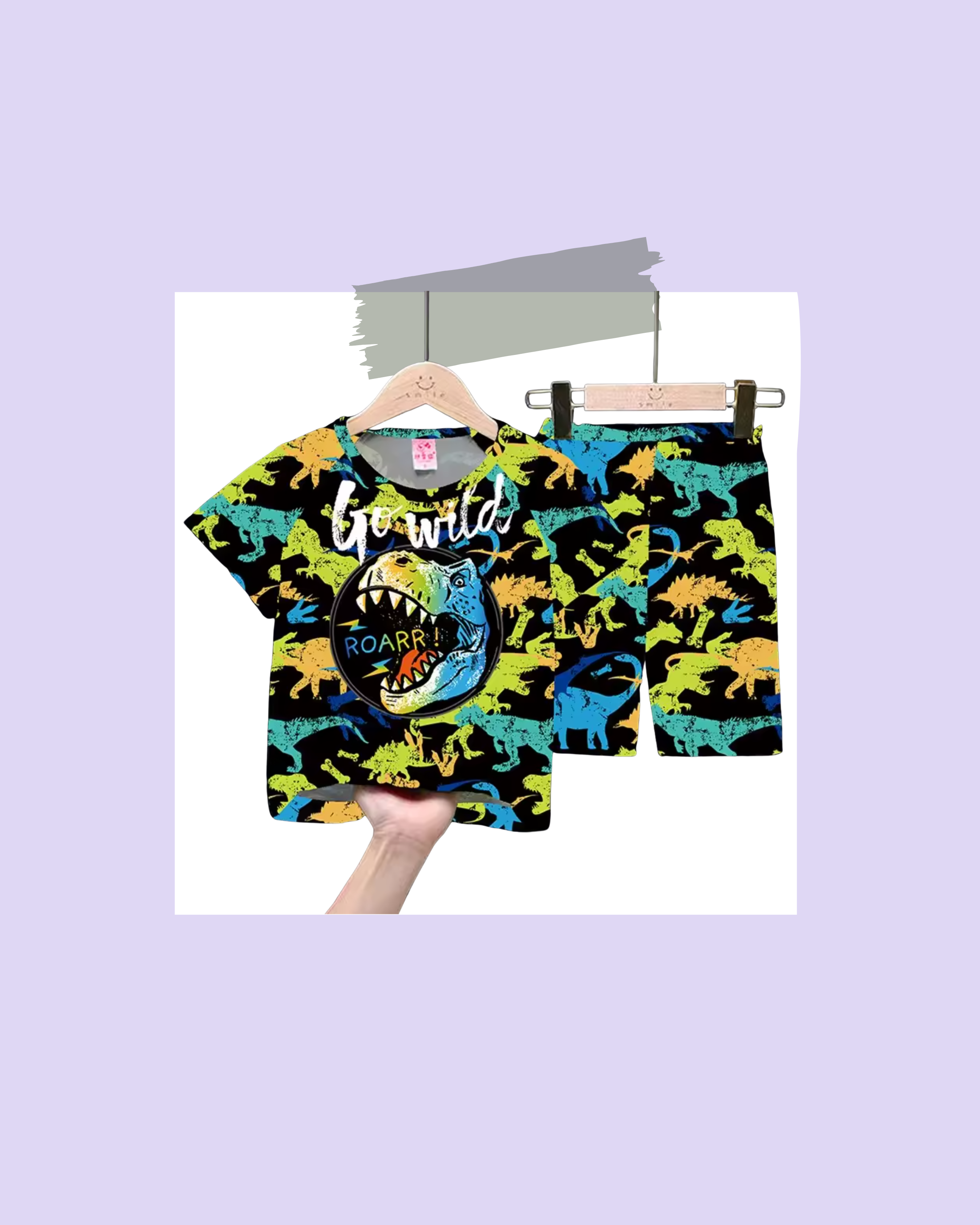 Colorful cartoon-print t-shirt and shorts set for kids, perfect for everyday wear and playtime.