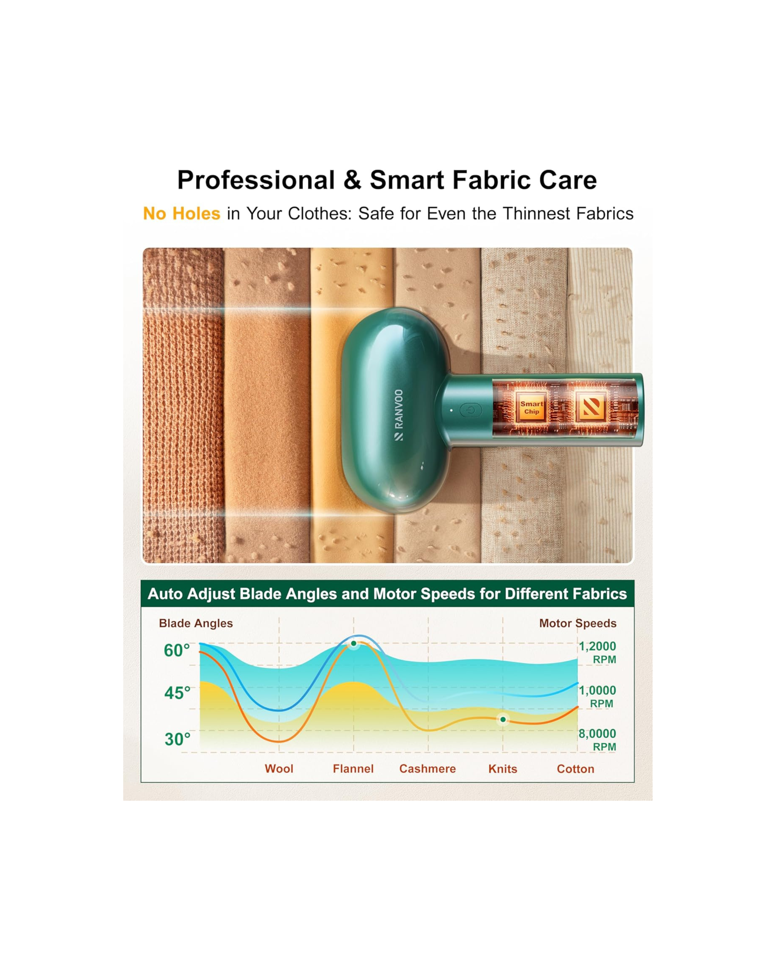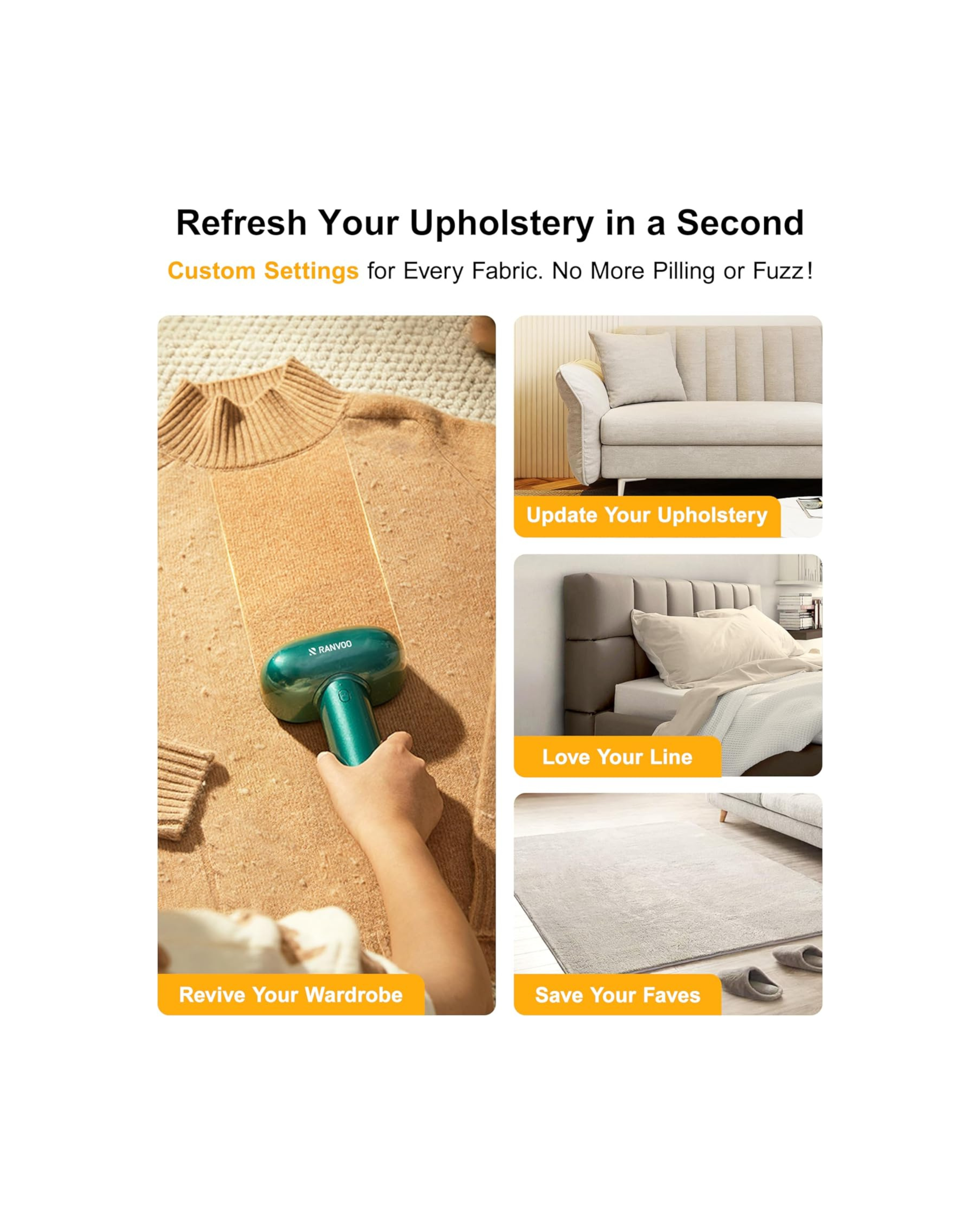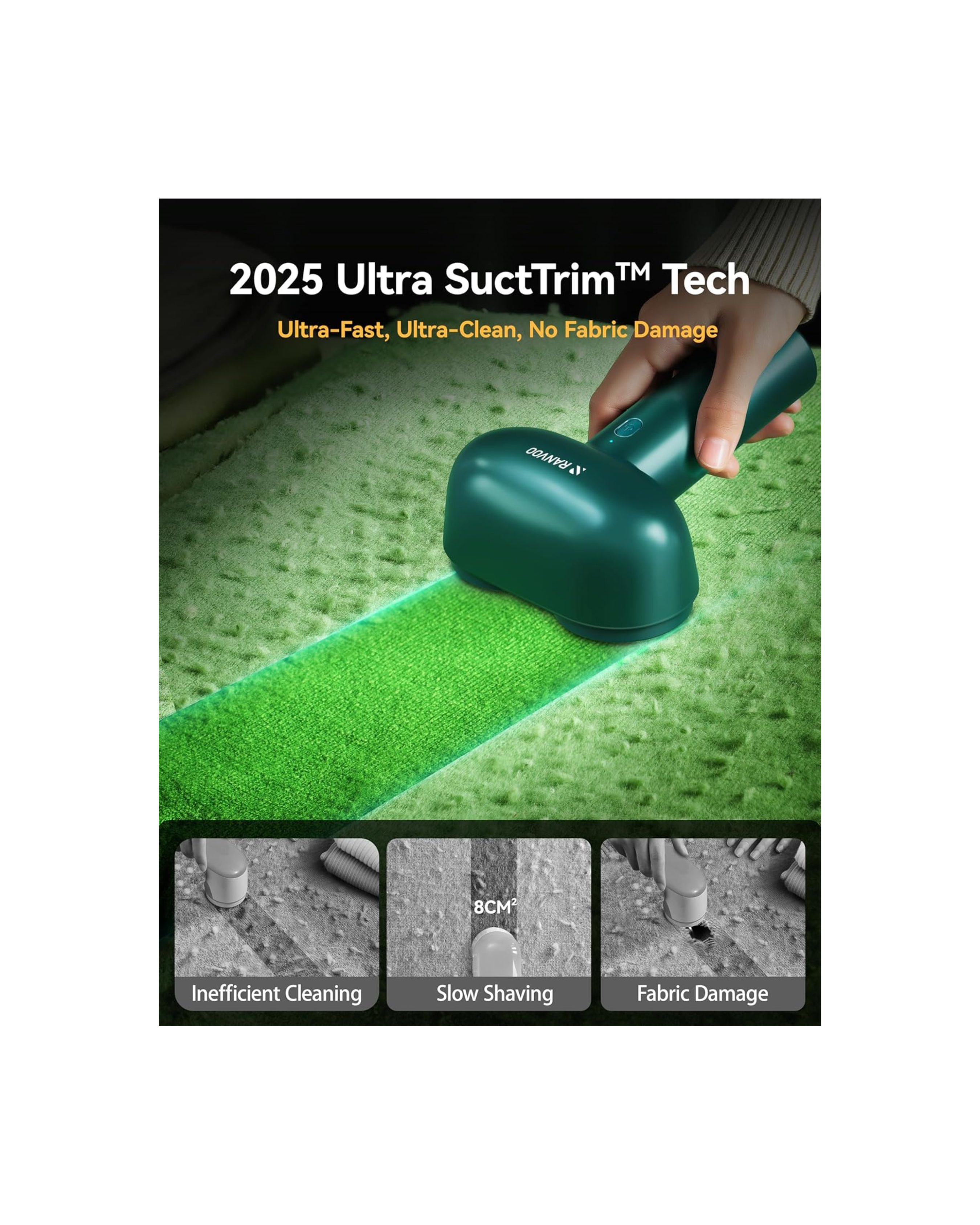 Revive your fabrics with the RANVOO Dual Head Fabric Shaver, a premium rechargeable lint remover designed to restore your clothes and upholstery to a like-new finish.
